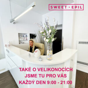 Jsme tu pro Vás každý den 9:00 – 21:00, včetně víkendů a státních svátků. Takže i o Velikonocích máme pro Vás OTEVŘENO! REZERVUJTE si svůj termín ONLINE zde: https://www.sweet-epil.cz/rezervace/ OTEVÍRACÍ DOBA BĚHEM VELIKONOC:18.4. Pá 9:00 – 21:0019.4. So 9:00 – 21:0020.4. Ne 9:00 – 21:0021.4. Po 9:00 – 21:00 Přejeme Vám krásné a pohodové velikonoční… Více informací: Velikonoční otevírací doba - Rezervace online